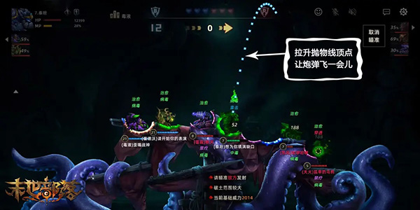 4、炮弹的飞行时间与炮弹的威力成正比,所以玩家在发射炮弹的时候,尽量在能瞄准目标的落点的情况下,最大限度的提升抛物线顶点的高度,让炮弹飞的久一点,这样炮弹在落下时威力也会增加,造成更大的伤害。