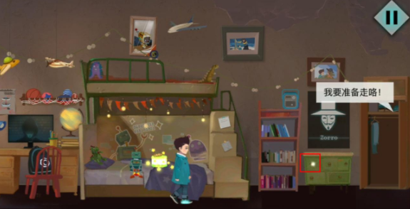 3、机器人,一个位于书包内部,另一个藏于侧边衣柜中,取出后放到床上。