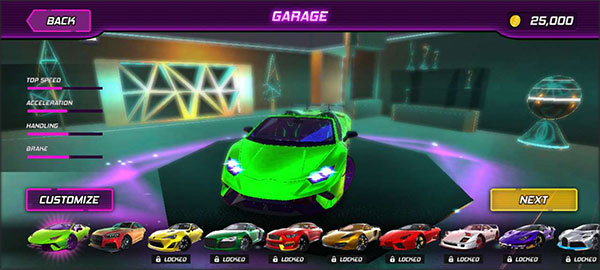2、使用游戏币开启新赛车,性能差异带来多样驾驶体验。