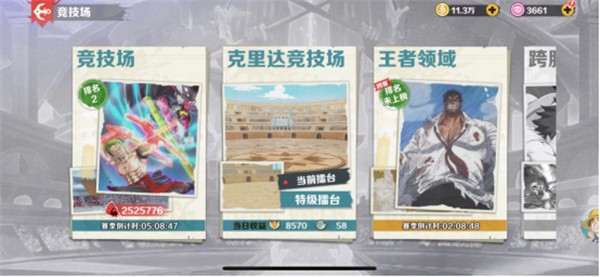 5、历练,是获得金币、经验值和突破剂的主要途径,主要分成危险的因佩尔监狱、休闲的龙宫城和充满激情的四皇挑战等。