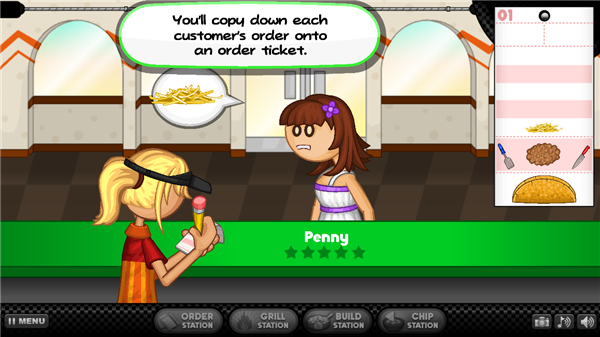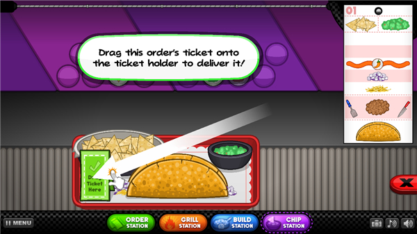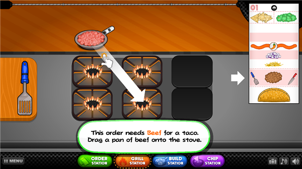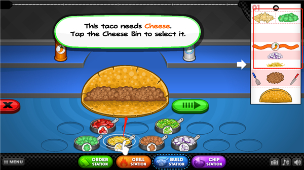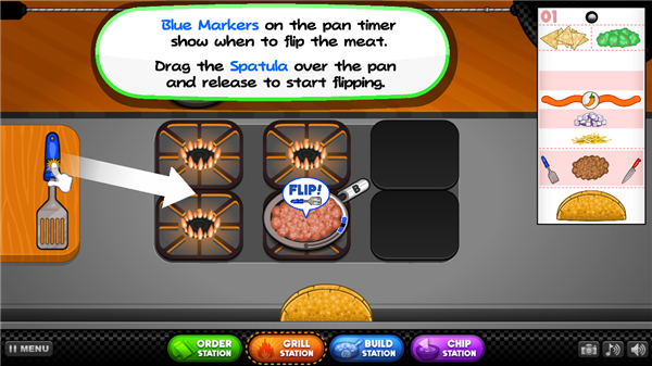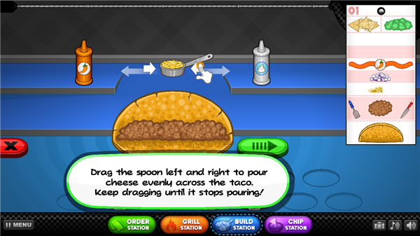 老爹的塔可店中文(Papa's Taco Mia)是经典的餐厅模拟经营游戏,玩家管理一家塔可店(卷饼店),需要制作顾客的塔可,赚取金币,用来升级店铺,让它成为小镇的热门店铺。每个顾客的订单都需要玩家亲自操作。首先,把肉放进锅里烹饪,并注意翻面时机。肉煮熟后放进卷饼里,按照顾客的口味添加不同配料,再加上一些脆片和新鲜沙拉,就可以完成订单。此外,玩家在老爹的塔可店中文中还可以收集更多食材,搭配出各种美味的塔可,吸引更多顾客光顾。