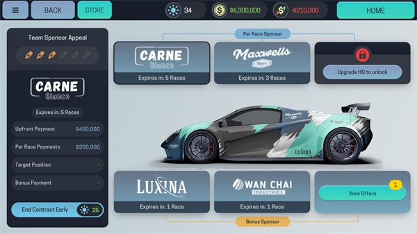 1、赛车可通过研发零部件或直接采购提升性能,配置越高名次越稳。
