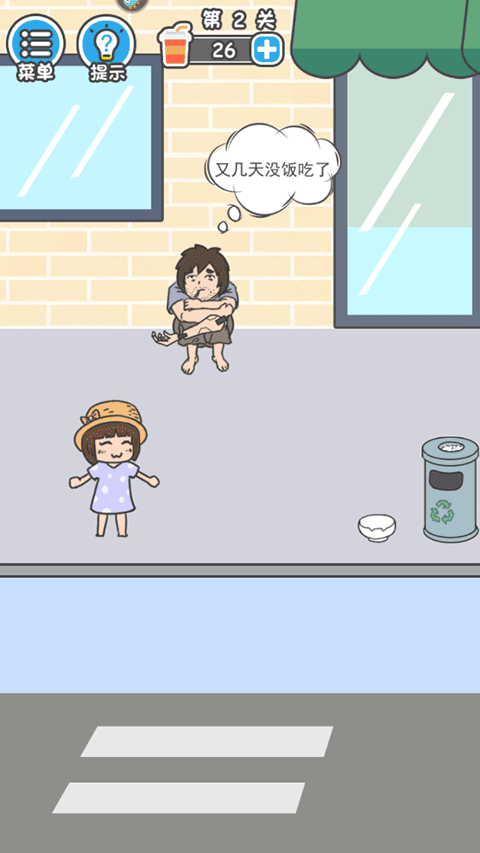 2、捡起路边的碗,按动拖住到乞丐身上,就会有路人施舍一点钱给他,即通关成功。