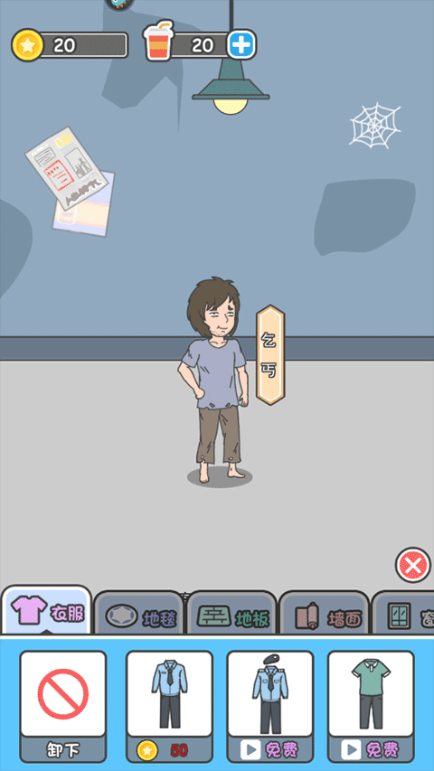 1、游戏使用的是闯关模式,游戏讲述的是创业失败的你流浪街头,想办法赚点钱。