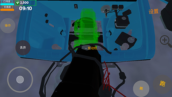 4、找到自己的车库之后,车辆是完全散装的状态,所以需要把车辆组装起来。需要做的事情就是将零件一个个的安装进汽车里(对准物品点击左上角操作,将物品放置到汽车指定位置,点击操作安装),将所有物品安装好之后进入汽车。