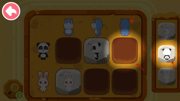 5、第二关分左右两边,左边上方对于的是动物的方向,即正面、侧面、后面,左边的左侧对应的是放置小坑的小动物,放到正确位置即可进入下一关。