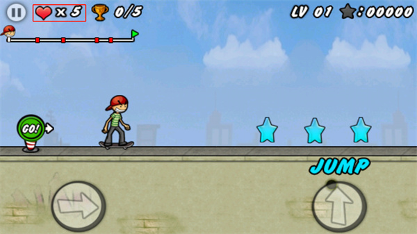 滑板男孩手游是围绕滑板闯关展开,少年能够驰骋于三种不同风格的场景地图中,途中会遇到各种障碍与陷阱,需要灵活操作角色完成炫酷的空中特技,躲避它们并安全落地顺利冲向终点。在滑板男孩手游下载安装中,有着多个极具挑战的关卡,每一关都为玩家提供五次尝试的机会,尽情展现极限滑板技巧吧。