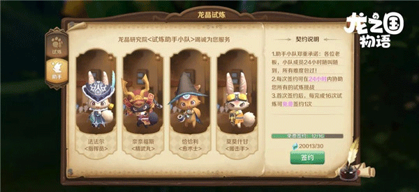 首次签约只要30蓝钻,每完成16次试炼可免费签约1次。签约试炼助手小队,就可以获得它们24小时内随叫随到的协助。