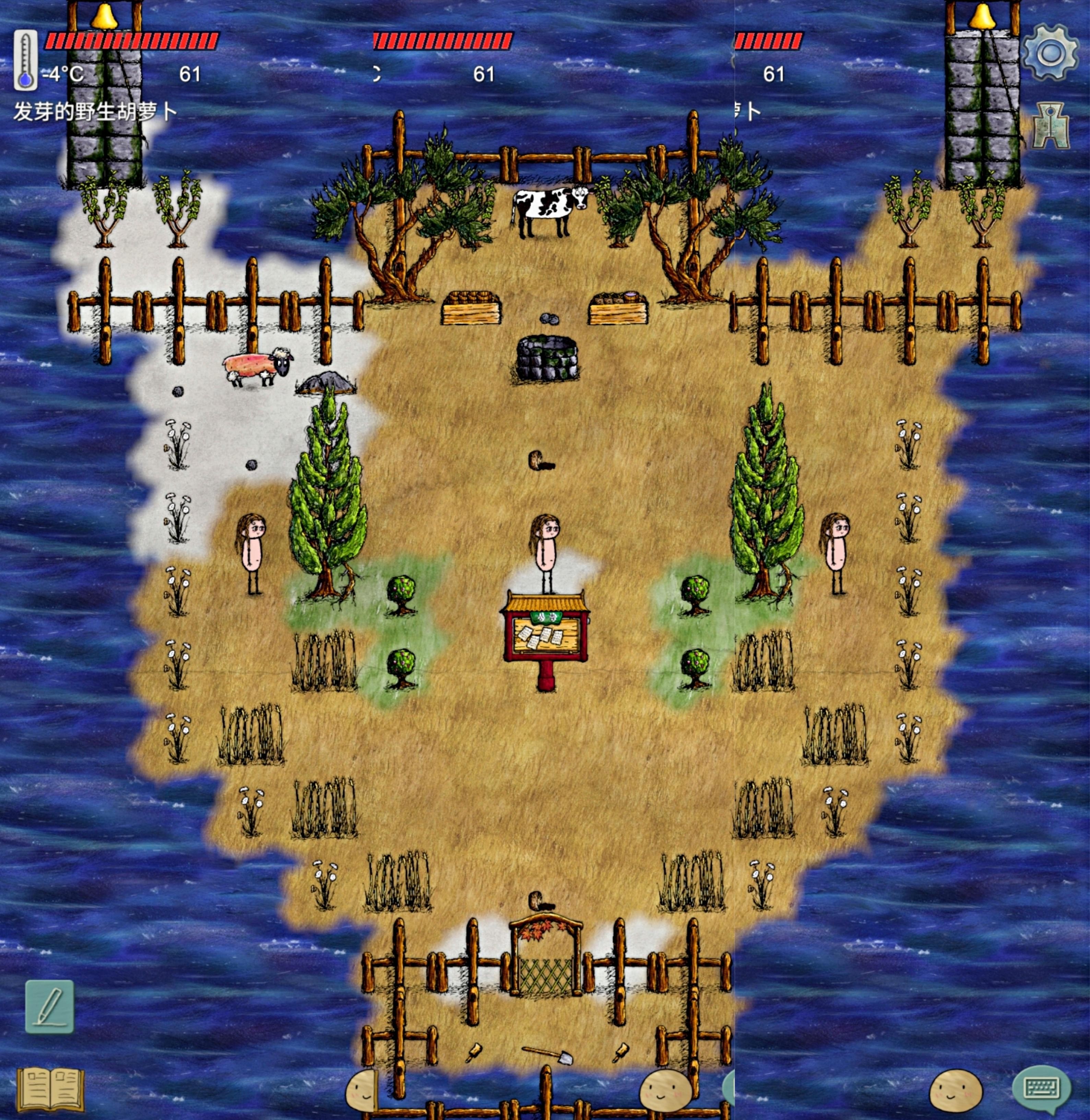 3、左边树后头藏着个铲子,右边树后面藏了摞碗。用圆石在大石头上打磨出尖石,挖两根胡萝卜,砍3捆麦子拿树枝打成麦秆。盛两碗醋栗胡萝卜,一碗喂羊,一碗用尖石捣成酱倒麦秆上加碗水铲上坨羊粑粑堆肥。堆肥要等待4分钟,可以趁这个时间挤牛奶养娃娃,春节限定的大棉袄也来一件。