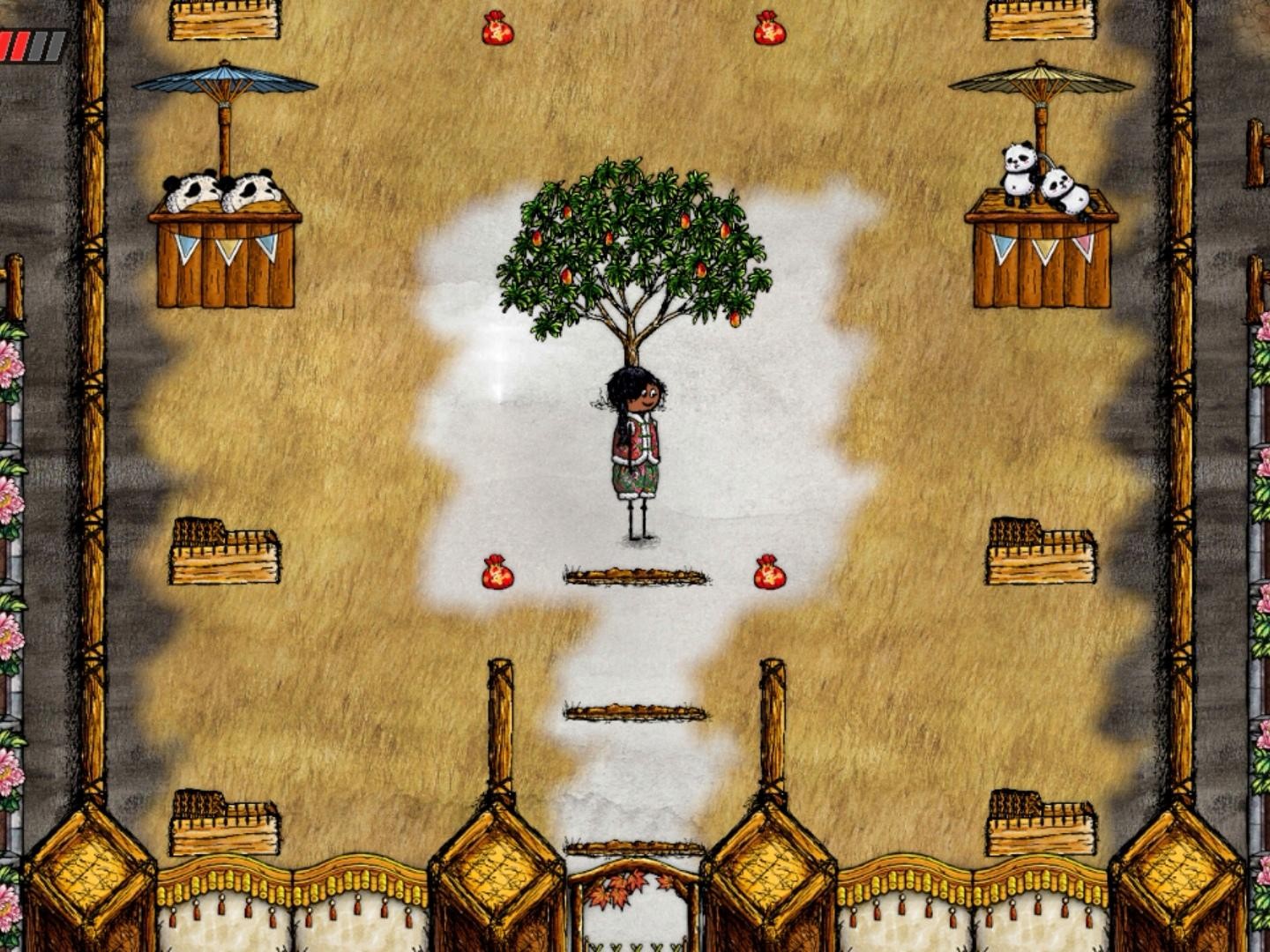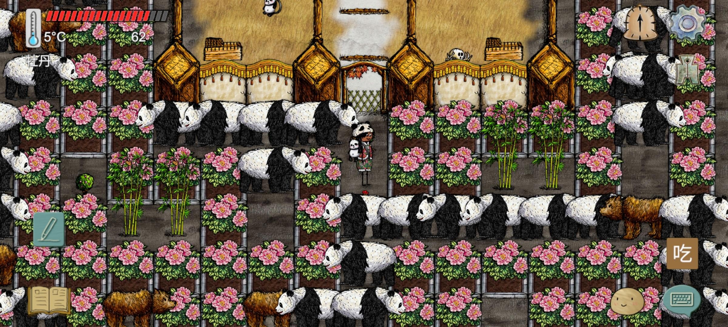 2、牡丹花围成的迷宫里塞满了熊猫和熊,趁着熊不在的时候火速在熊猫的掩护下冲过去。大体方向是向右然后下然后左,路上小心被熊咬,可疼。