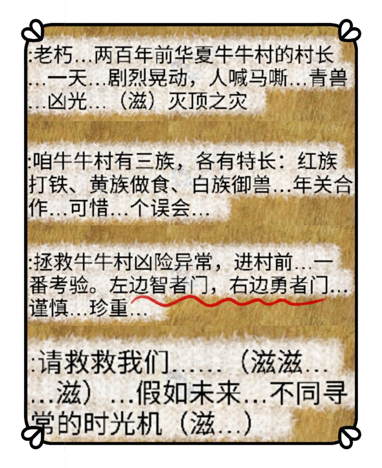 2、点击公告栏,我们收到了来自两百年前的信息。牛牛村遇到袭击了?时光机在哪里?