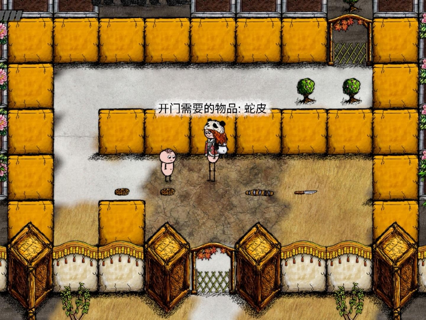 4、穿过熊山熊海,拿路费进了黄色的奇怪建筑,捡起地上的刀干掉沙漠地形上的蛇,剥下蛇皮就可以出门啦,当然刀要揣走后面关卡可以用。