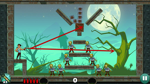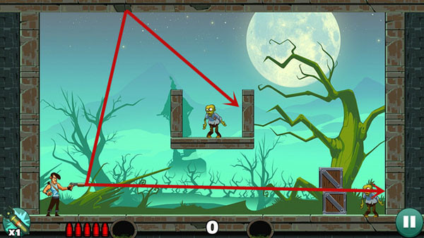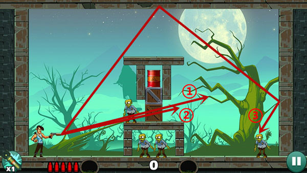 直线瞄准射击即可过关,多尝试反射角度可实现一发清场。