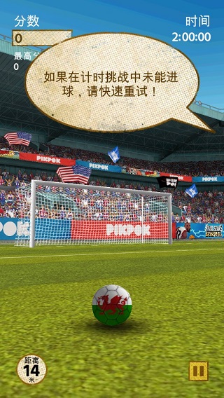 学会了这些,我们就可以开始游戏了,首先是“技巧击球”模式,这个模式就是测试你在1分钟的时间内能踢进多少个“死角”任意球(Skill Zone),每进一个死角任意球得一分,时间加3秒;普通进球不得分,但可以增加一秒的时间。