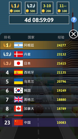 3、每期活动结束后,玩家可根据自己所在国家的排名获得相应的金币奖励。