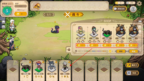 3、开始游戏后,玩家可以在右侧购买棋子,相同三个棋子可以合成升星。
