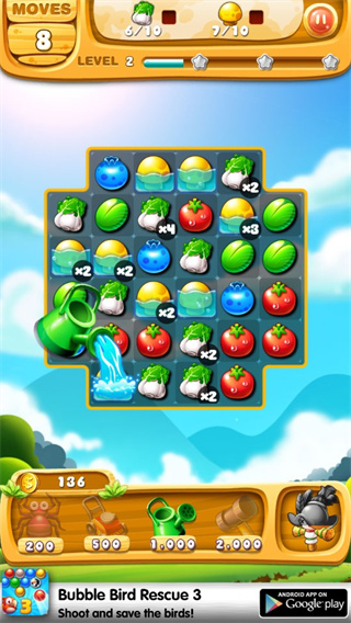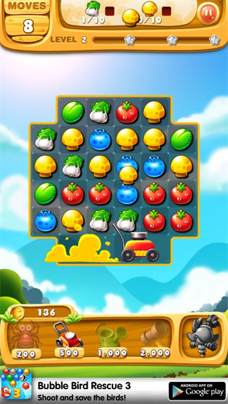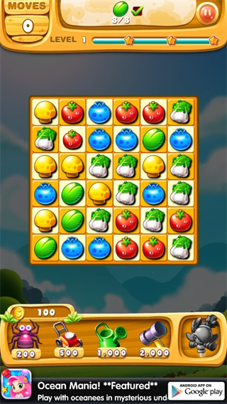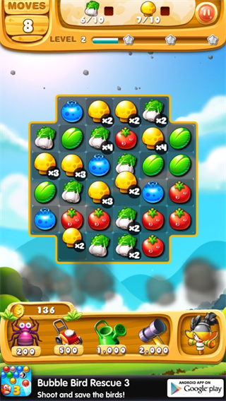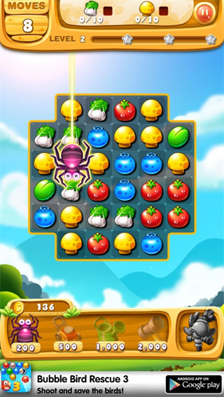 狂热的花园安卓版(gardenmania)是以农作物为主题的三消休闲游戏,整体画风温馨可爱,带有浓浓的田园气息,玩起来非常轻松治愈。在游戏中,玩家可以透过消除各种可爱的蔬菜和水果来收集资源,打造属于自己的农场乐园。同时,狂热的花园安卓版的关卡设计丰富,每关都有不同的目标,玩家需要动动脑筋来完成消除任务。而且,还有很多实用的道具,比如交换、清除等,能帮玩家更快通过难关。