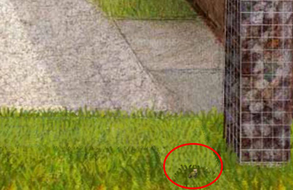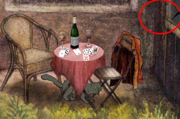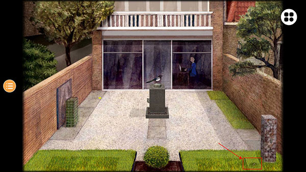 点击庭院的桌子放大,如图,点击右侧玻璃,再点击Milo,Milo进入小屋子。