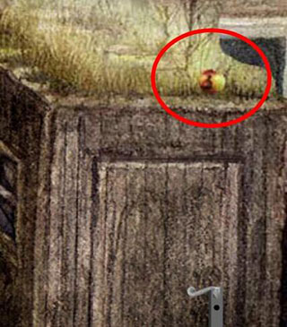 进行下一部分,点击自行车发现四位数密码,再次点击自行车旁边的画,可知画上的内容提示了密码,从左到右依次为画笔、啤酒瓶、青蛙和苹果。