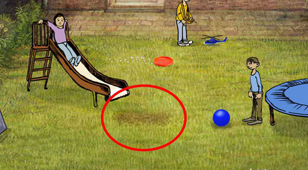首先点击直升机,将喜鹊吓到树枝上,再点击蹦床上的男孩三次,将喜鹊吓回屋顶,此时,围墙右侧老妇人的目光会跟随喜鹊移动,当老妇人看向屋顶时,迅速点击老妇人,将柱子上的蓝球弄下来。