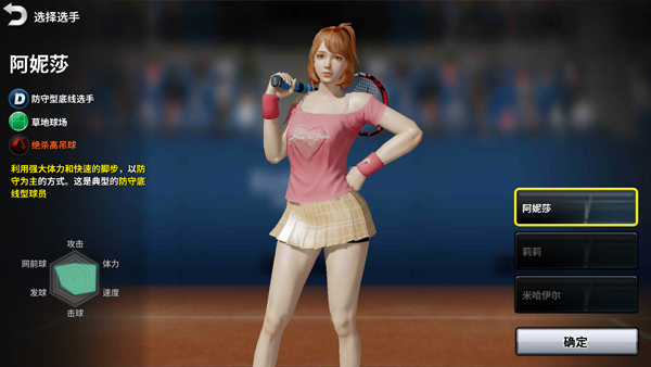 主打底线进攻,切球精准,擅长牵制对手移动。