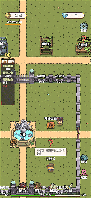 开局先领取族长上方的宝箱,内含金币与钻石,随后接取任务完成基础流程。