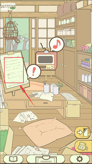 1、首先来到了游戏的室内界面,这里有一台看广告获取奖励的电视,还有一块发布帮助信息的画板,现在点击这块画板。