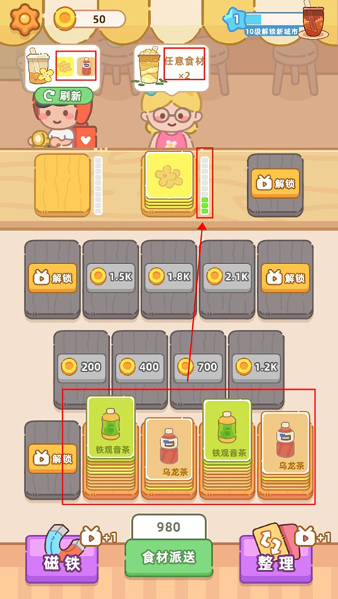 3、玩家透过完成订单可以获得金币,在拥有足够的金币后可以解锁其他额外卡片格子。