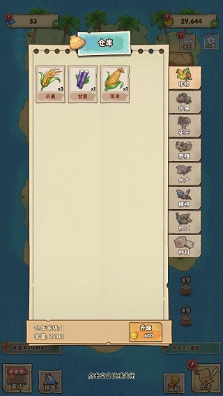 9、收获后的物品将被存入到仓库中,仓库里存放着所有物品,不过仓库有容量限制,这点跟【外婆的小农院】一样,升级仓库可以提高容量。