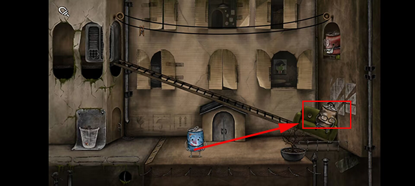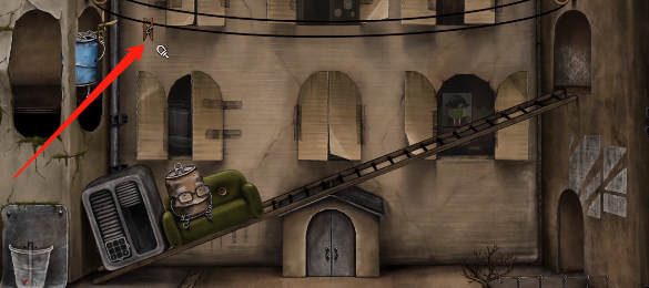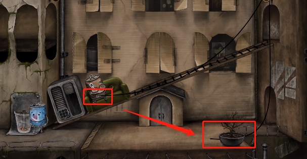 10、绳子断裂后会自动连接盆栽和老人,我们将盆栽推下,就可以引导老人回到房间。