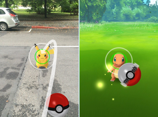 3、点选自己的神奇宝贝球滑向神奇宝贝就可以开始抓取了。点击宝贝球可以看到中间有个绿色圈圈不断由大而小的出现,如果能够将宝贝球掷入圈内,就能得到额外的经验值。如果按着宝贝球不断画圈,宝贝球就会开始转动,这时你丢出宝贝球就会变成抛物线,如果成功抓取一样会有额外的经验值喔!(建议关闭及时AR 模式比较好抓取也比较省电)