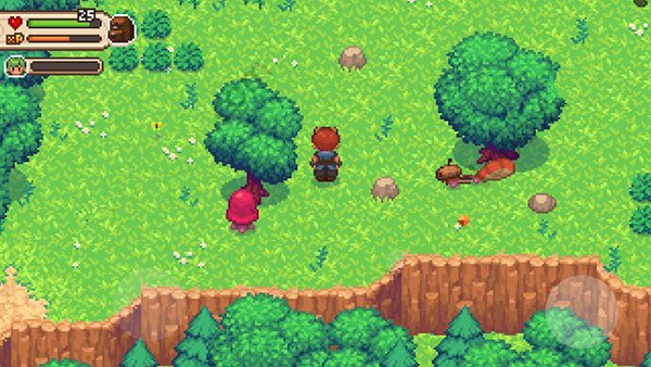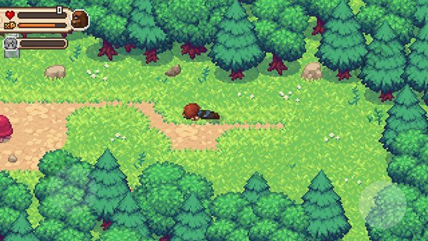 5、在没有武器的时候路上的灌木丛会挡住玩家的去路,有武器的时候只需要点击攻击就可以击毁灌木丛,在击毁灌木丛后有几率掉落补血的红心和金币。在屏幕的左上角绿色条是玩家的生命值,底下的黄色条是经验值,击杀怪物后可以获得大量经验升级。