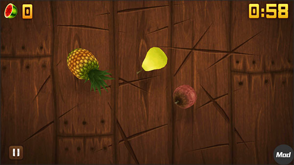 一分钟内狂切水果避炸弹,得分为王,炸弹扣分但不终止游戏。