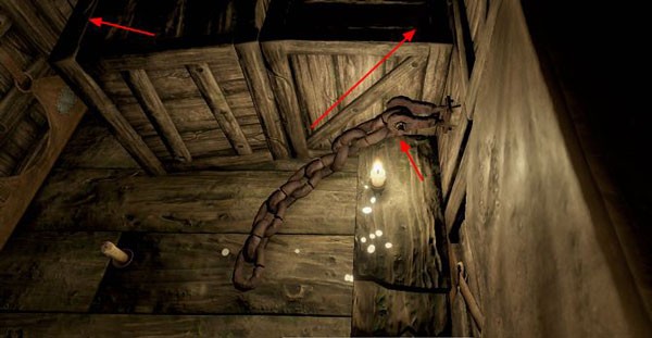 2、沿着此处铁链跳上去,上面有一根蜡烛,然后斜对面隐藏有一根蜡烛。