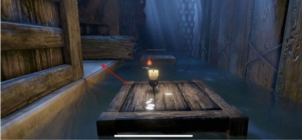 3、相信有许多朋友不知道这个漂浮的木盖板其实是可以推动的,推动过去跳上去,会发现这里藏着一根萌萌哒的蜡烛。