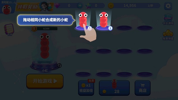 2、拖动两条同种蛇即可合体,形成外观和属性不同的进化蛇。