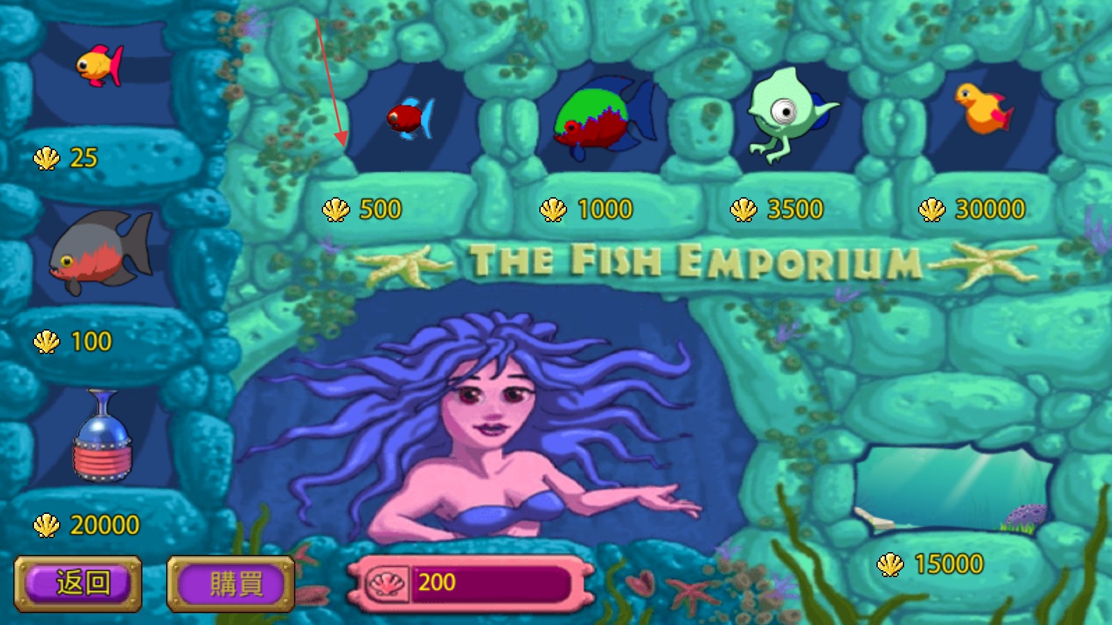 3、在商店界面,查看所指的鱼类或道具及其对应的贝壳价格,点击【購買】按钮购买相应物品。