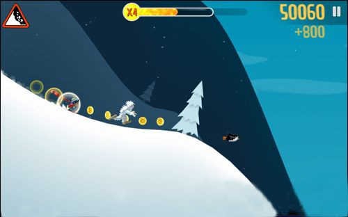 出现几率仅次于企鹅,刚骑上的时候跑得速度很快,但受到一次冲击后,就会变成滑雪模式,在滑雪模式下,假如再擦到一头企鹅,就会将之带在身边,可以为你抵消一次冲击。不过你最多只能带一头企鹅,加上雪人可以为你抵消两次冲击。不过雪人动作比较迟缓,你假如想借助它来翻跟头往往结果会是摔一个狠跤。