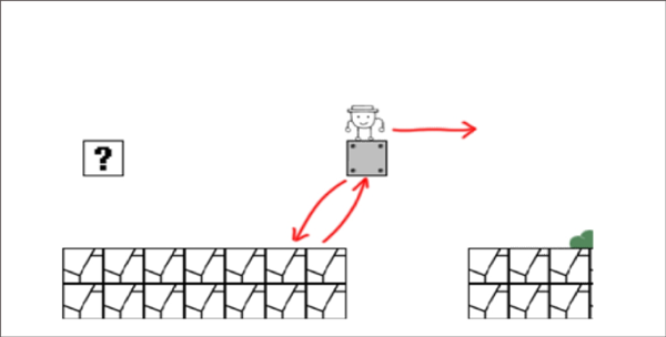 2、这时候跳一下,第一个机关就会出现了,大家可以直接跳到“?”的砖块上,然后再在边缘处跳出第二个机关。跳到机关上再向右跳,不过此时要把握好距离,游戏中所有的云都是带“刺儿”的。