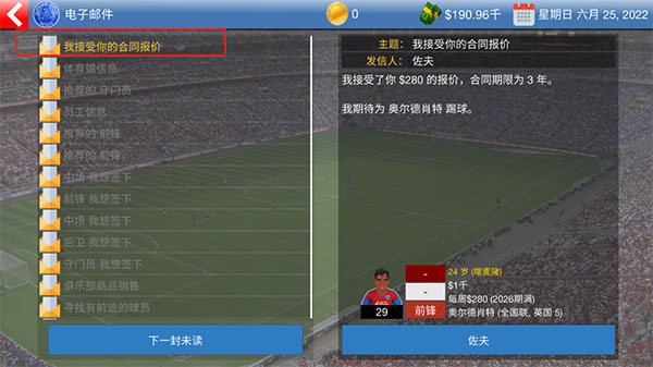 5、最后在收件箱里面查看,如果球员接受报价就代表购买成功。