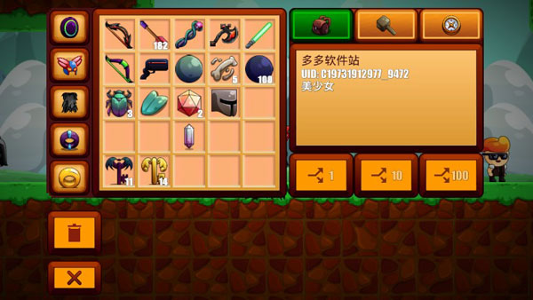 通过钻石旁“+”进入商店,自由购买武器、防具、饰品等,在背包中拖拽到装备栏即可生效。