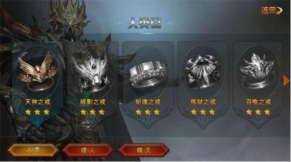 分为人类、矮人和精灵三种魔戒,分别解锁独特技能和地图,提升战力与游戏成就感。