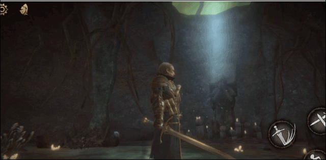 屏幕左下方虚拟摇杆移动角色,右下为轻击、重击、闪避与防御键位。