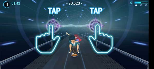 操作滑板少年的同时滑动触碰光点,点得越多得分越高。