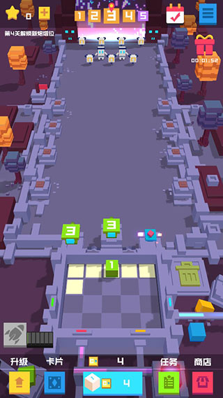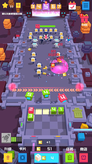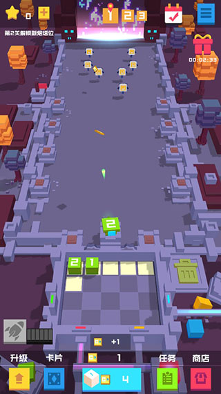 解锁自动合成功能后可轻松升级方块,商店提供宝币与强化卡牌。
