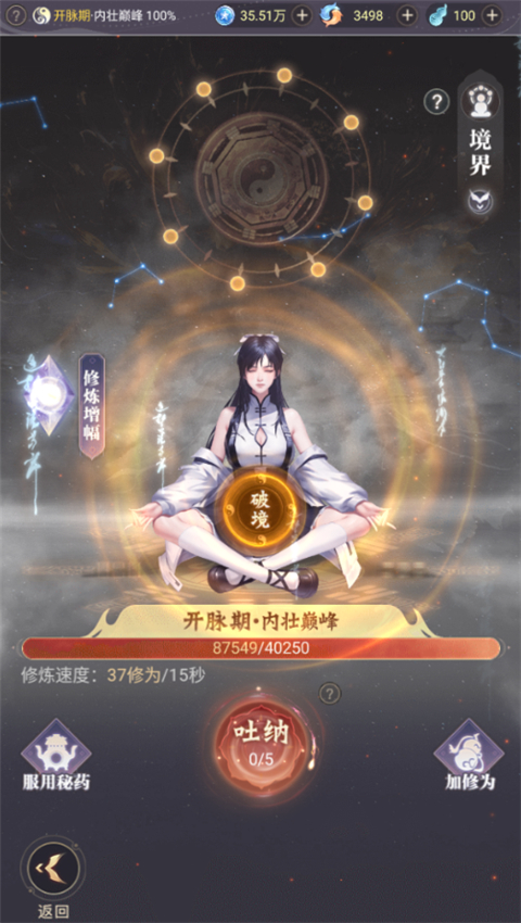 通过放置修炼、炼丹与灵气池升级加速成长,境界突破可解锁伴修、公会修炼室等功能。