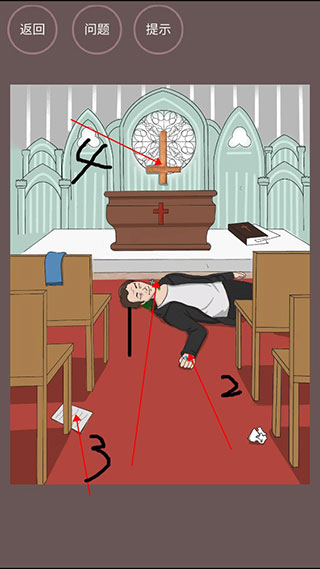 点击十字架、死者手、左下纸张和后方十字架完成线索收集。