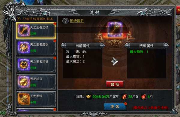 洗练可强化装备属性,需洗练石或特殊晶体,魔龙级以上装备方可操作。