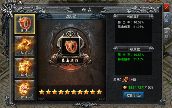 特戒含神剑、狂风等,升级需碎片与元宝,可神铸五行,大幅增加属性。