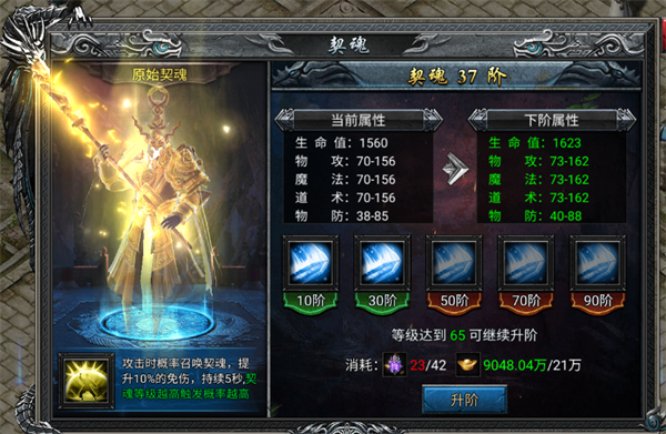 契魂可增七种属性,稀有生命属性最强,升阶需契魂灵,等级越高属性越高。